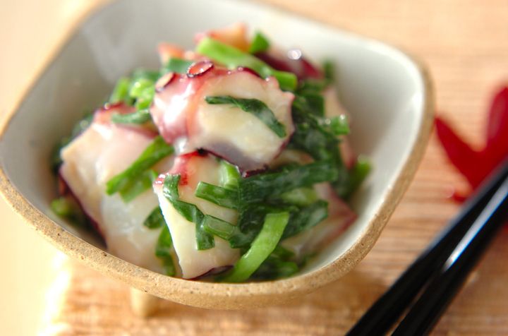 茹でたニラとタコをからし酢みそで和えましょう。ニラのビタミン、タコのタウリンで疲労回復効果も期待できます。しっかり食感で、食べ応えも十分。ビールや日本酒、焼酎とのペアリングも最高です。