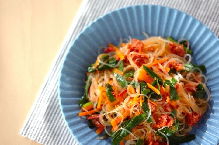 韓国風の甘辛味が食欲をそそり、暑い日でもさっぱり食べられるメニューです。ニラとニンジンは春雨と同じ鍋で茹でて調理時間を短縮。牛肉の代わりにコンビーフ缶を使うので手軽に作れますよ。