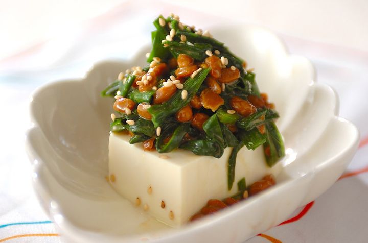 ニラと納豆の最強コンビでパワーアップ! さっぱりスタミナ満点のアレンジ冷奴です。しょうゆにゴマ油の風味やからしのピリ辛が効いていて、食欲をそそります。豆腐ではなく、熱々のご飯にのせても絶品です。