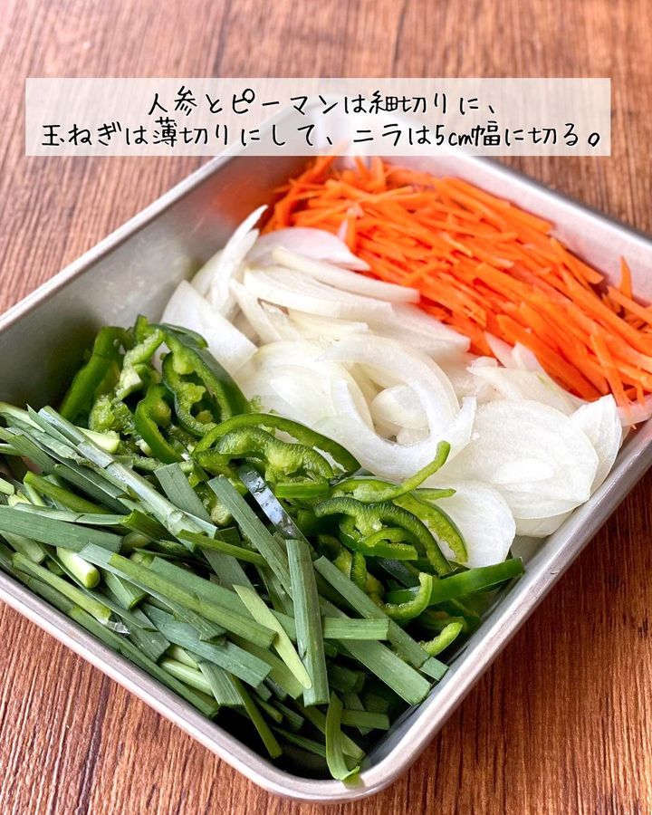 1. 牛薄切り肉は細切りにする。人参とピーマンは細切りに、玉ねぎは薄切りにして、ニラは5cm幅に切る。糸こんにゃくは熱湯で3分茹でて水を切り、食べやすい長さに切っておく。