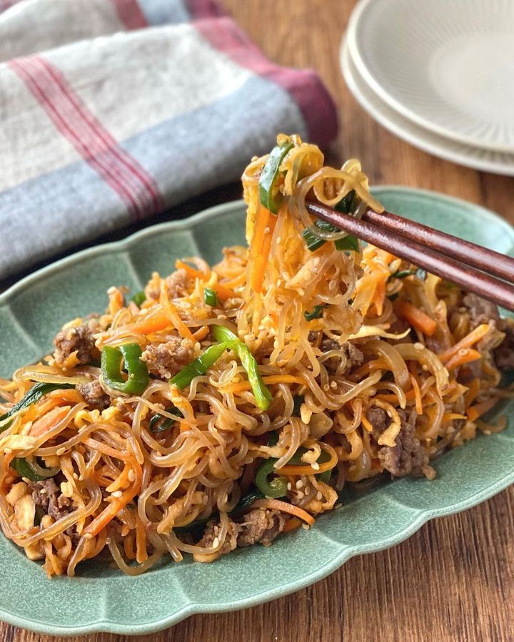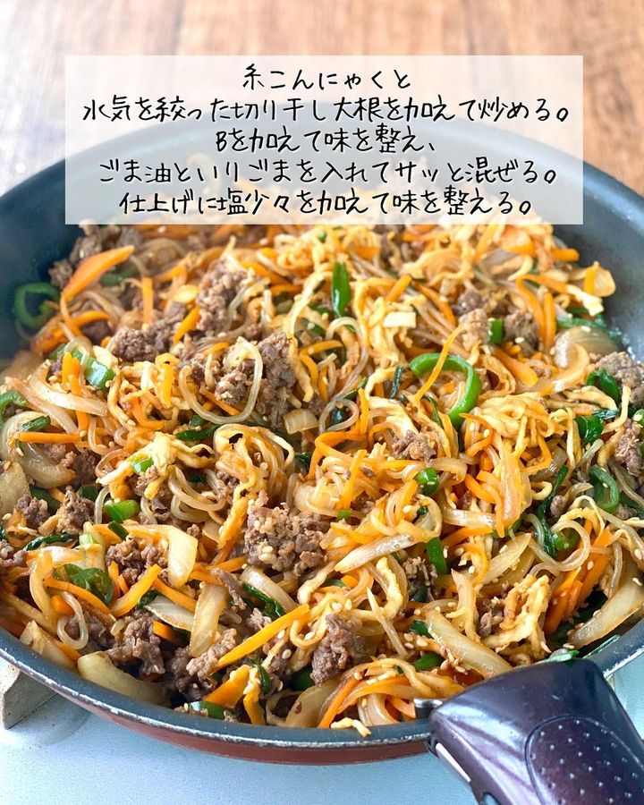 春雨の代わりに糸こんにゃくと切り干し大根を使った、チャプチェ風炒め。
