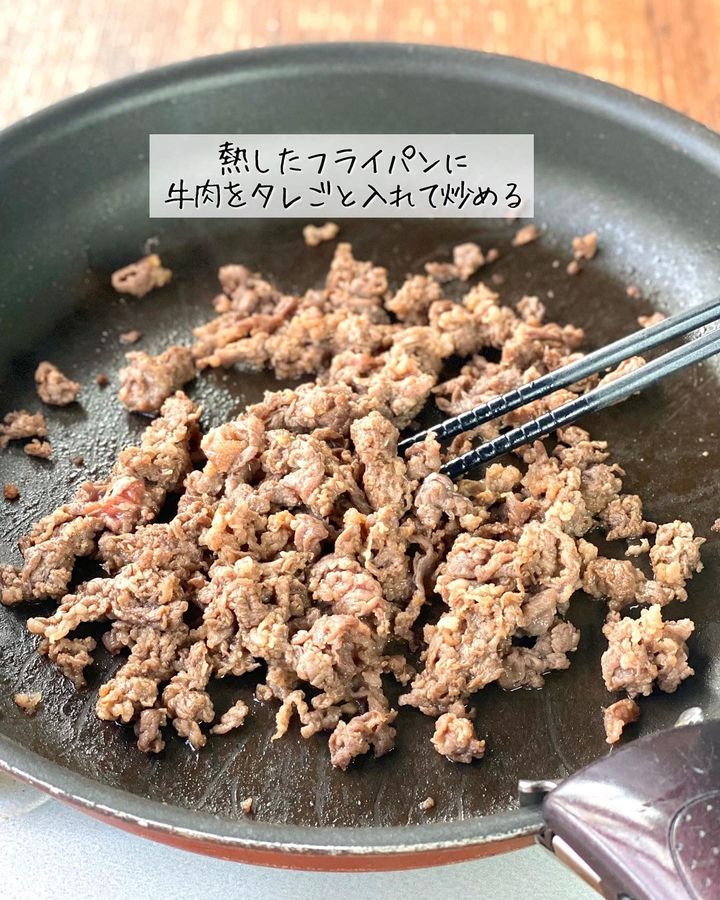 3. 熱したフライパンに牛肉をタレごと入れて炒め、牛肉の色が変わってきたら人参、ピーマン、玉ねぎを加えて炒める。野菜に火が通ったらニラと塩を加えてサッと炒める。