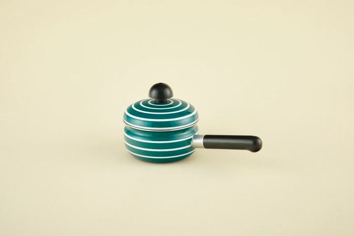 オーストリアのウィーンに工房を構えるカール・オーボックが、同じくオーストリアの食器メーカーである〈Ostovics〉のためにデザインした琺瑯の鍋。以前にもブルーの鍋を紹介しましたが、こちらは深いグリーンとホワイトの渦のような模様がユニークです。最近はこのような楽しいデザインの鍋をなかなか見かけないように感じます。ハンドルの太さや先端の形状、蓋の持ち手など、細かい部分にモダンなかっこよさを持ち合わせているのです。
