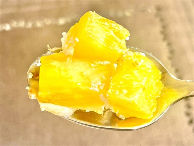 まずは、クリームとパインからいただきます。パインはとにかくみずみずしい! とてもジューシーで、口の中は果汁でいっぱいです。生クリームはかなりさっぱりしていて、ほとんど甘くありません。