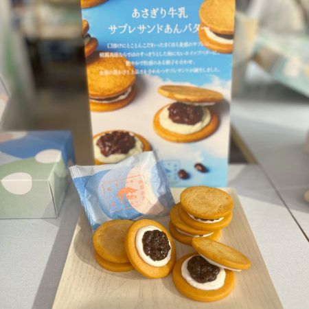 さくほろクッキーとホイップバター、そしてあんこが合わさった「あさぎり牛乳サブレサンド(あんバター)」(5個入1,500円)は、クッキーの食感が面白い!