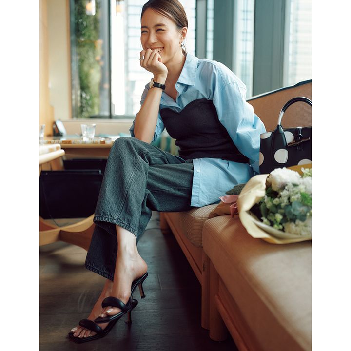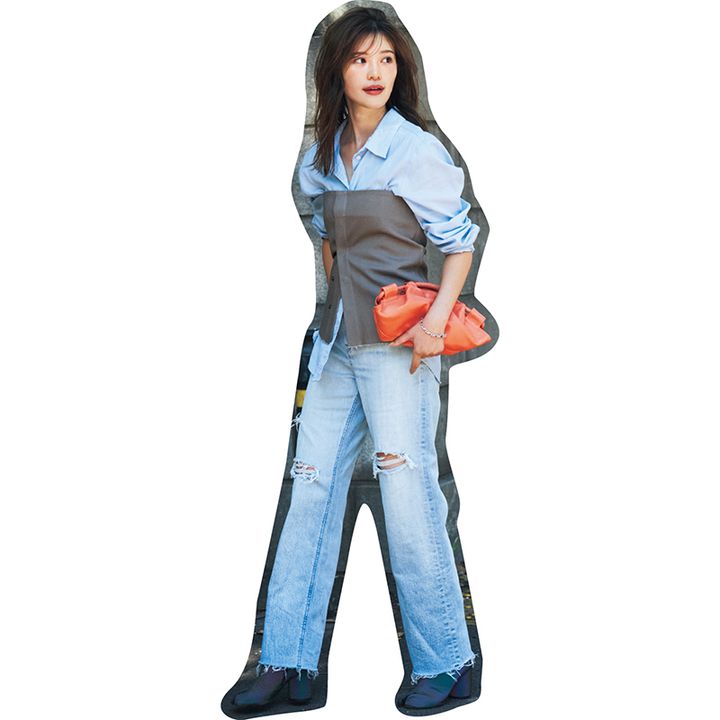 デニムとシャツの水色ワントーンのコーデに、ビスチェを締め色で追加。シャツはアンフィーロ、パンツはル フィル、ビスチェはティッカ、バッグはフランソワ レニエ。