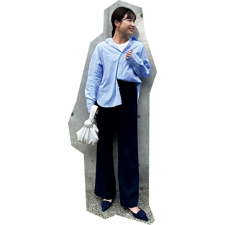 水色とグレーの色合わせが知的。シャツはエイチアンドエム、ビスチェはガブリエラ コール ガーメンツ、パンツはヤヌーク、靴はメゾン マルジェラ、バッグはロエベ。