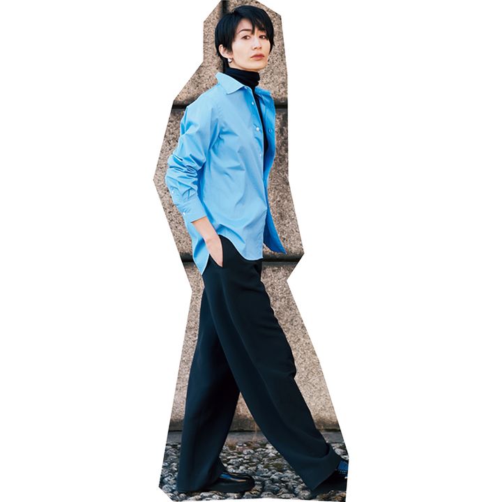 パンツとインナー、上下グレーに水色シャツを羽織れば、キリッとしつつも黒より優しげな印象に。シャツはシンゾーン。