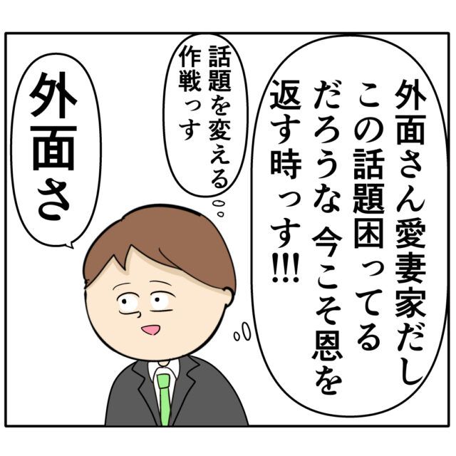 会社では愛妻家で夫の鏡と思われている良し男さんなので、同僚の目には背苦腹さんの話題に良し男さんが困っていると思われているようです。