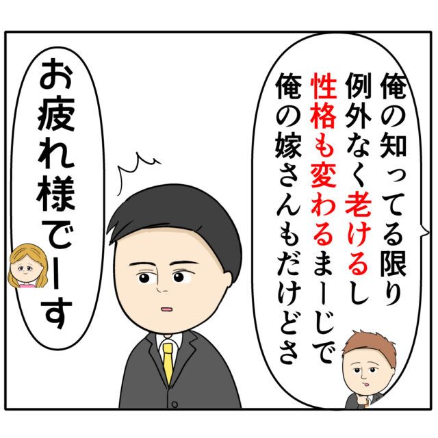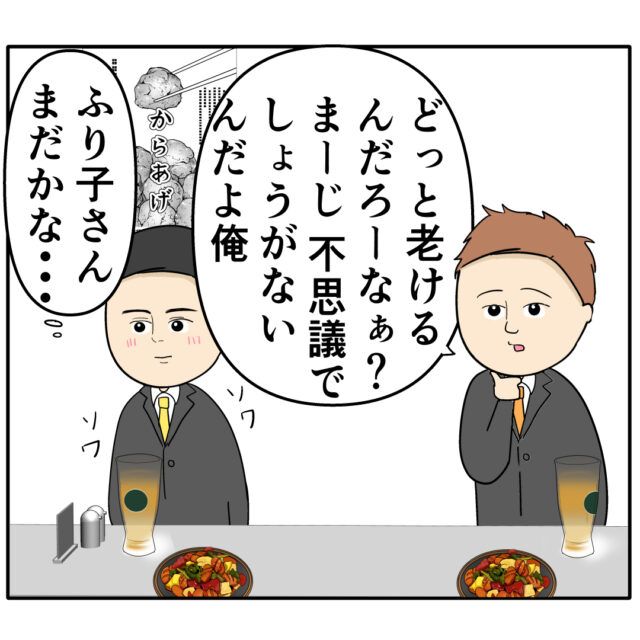 「例外なく老ける」「性格が変わる」、そして自分の妻のことまで言い始めたところでふり子さんの「お疲れ様でーす」という声が聞こえました。