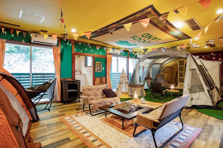 宿泊施設では、室内でキャンプを楽しめる工夫も。ロゴスのテントや寝袋で実際に寝泊まりすることができ、雨の日でもアウトドア気分を味わえる。