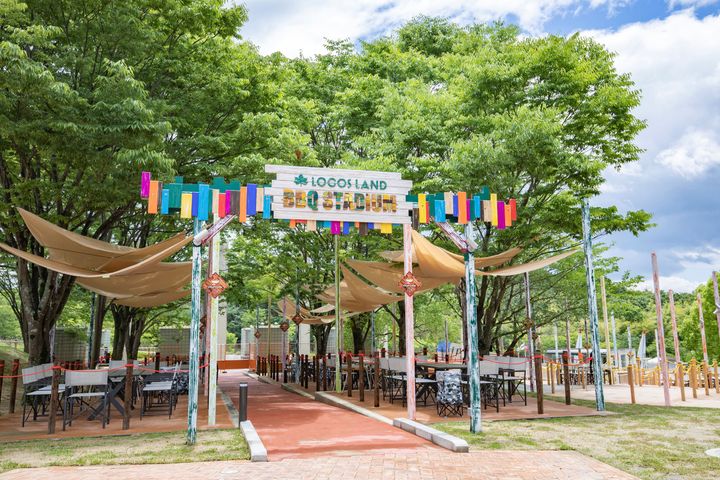 「外で、食べて、遊んで、泊まる。」をコンセプトに、 京都府城陽市とLOGOSのコラボにより生まれたLOGOS LAND。最大200名が利用できるBBQ場や手ぶらで焚火が楽しめるエリアなど、ロゴスならではのアウトドアが体験できる。