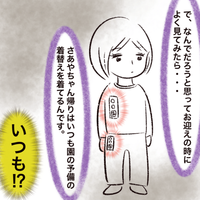 さあやちゃん帰りはいつも園の予備の着替えを着てるんです。」