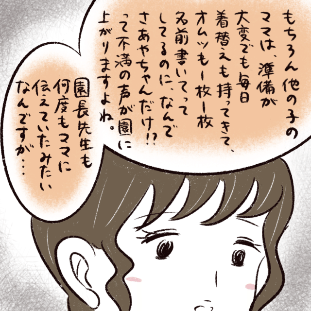 「もちろん他の子のママは準備が大変でも毎日着替えも持ってきて、オムツも1枚1枚名前書いてってしてるのに、なんでさあやちゃんだけ!?って不満の声が園に上がりますよね。園長先生も何度もママに伝えていたみたいなんですが・・・」