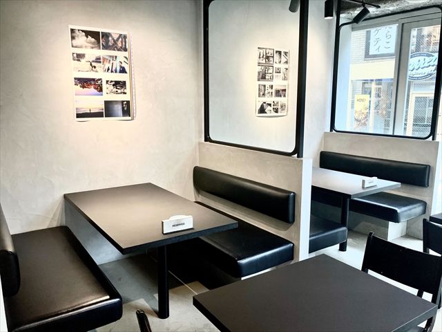 黒を基調とした店内。壁には写真などが貼ってあり、おしゃれな雰囲気です。広々としてゆったり過ごせます。