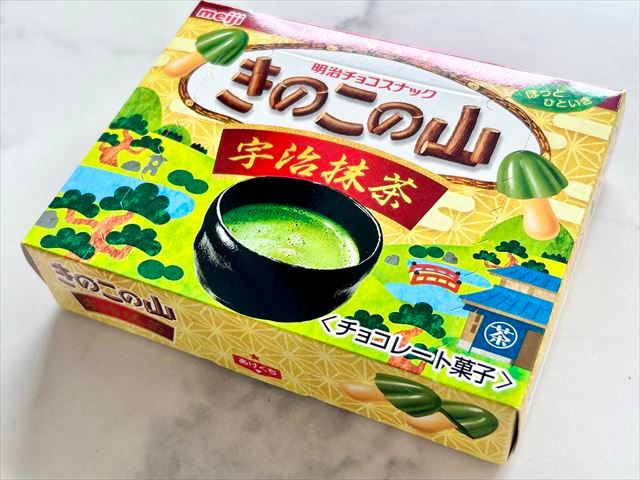 「きのこの山」は宇治抹茶の味。宇治抹茶とは、京都府・奈良県・滋賀県・三重県の4府県産茶を京都府内業者が、宇治地域に由来する製法により仕上げ、加工し、粉砕(ふんさい)・挽臼(ひきうす)加工した抹茶です。