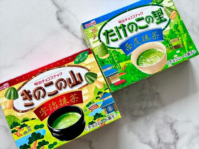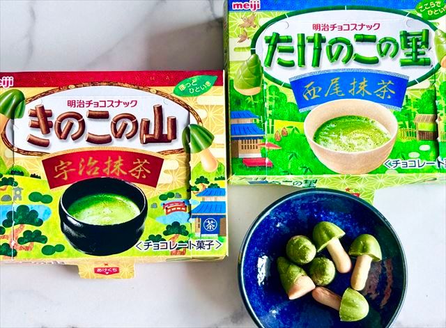あなたはどっち?「きのこの山 宇治抹茶」と「たけのこの里 西尾抹茶」食べ比べ♪