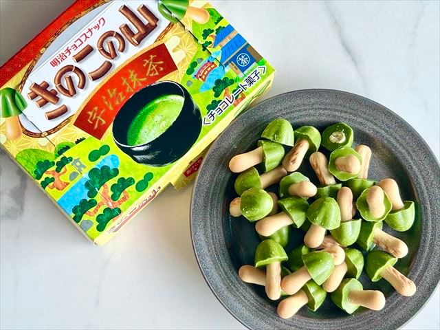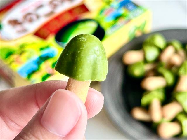 お馴染みのカリカリのクラッカー生地に、いつもと違う抹茶色のチョコレートがのった「きのこの山 宇治抹茶」。