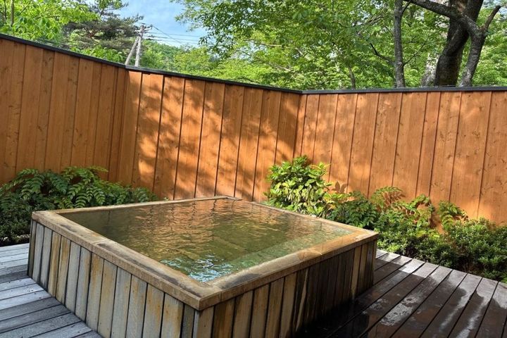 お風呂はすべて、自家源泉掛け流し! 時間制で男女入れ替わるサウナ付き大浴場のほか、貸切露天風呂も二つあります。貸切露天風呂は2022年にできたばかりで新しく、愛犬ルームと近いので何度も楽しみました。空いていれば何度でも行くことができ、電気を切って美しい星空を眺めることもできます。