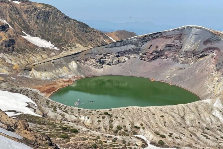 山頂から覗くエメラルドグリーンの湖。神秘的な「御釜」は必見!