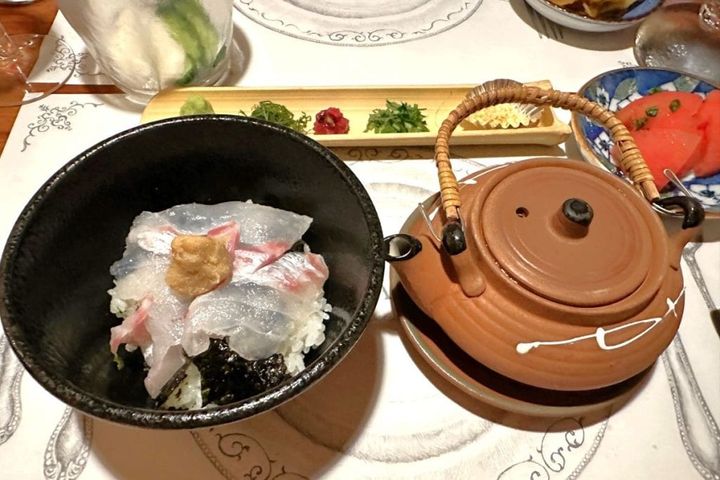 メインのあとにいただくごはんも、2種類から選べます。この日は「季節の炊き込みご飯(鶏ごぼう)」か「秘伝のだし茶漬け(鯛)」で、お茶漬けを選びました。新鮮な鯛にアツアツの出汁をかけて食べるお茶漬けは絶品で、すでにお腹いっぱいでしたが、ペロリと食べてしまいました。