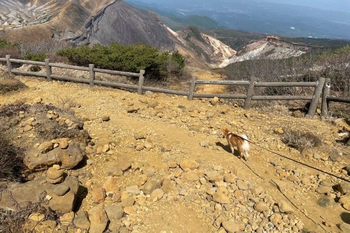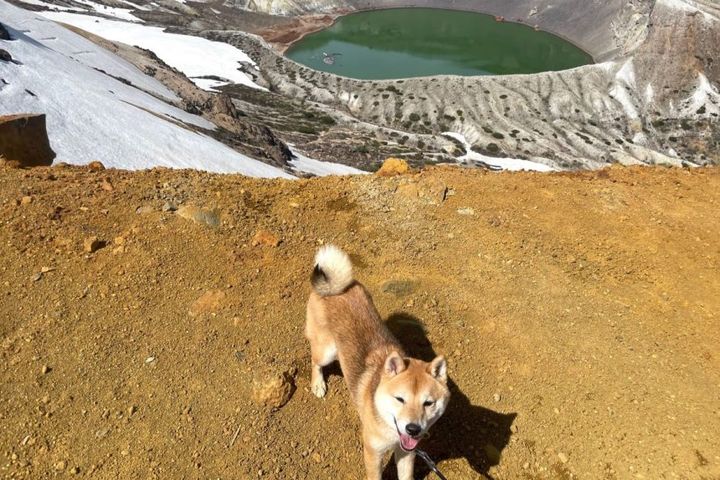 駐車場からは数分で御釜が見えたのですが、足場がかなり悪く、ふだん登山をしない私にとってはかなり大変でした。ところがさすがワンコ。まもるは岩を飛び越えひょいひょいと進んでいきます。山頂は道がかなり遠くまで広がっているので、御釜を見るべスポジを見つけるべくだいぶ歩きました。靴ははきなれたスニーカーなどがおすすめです。