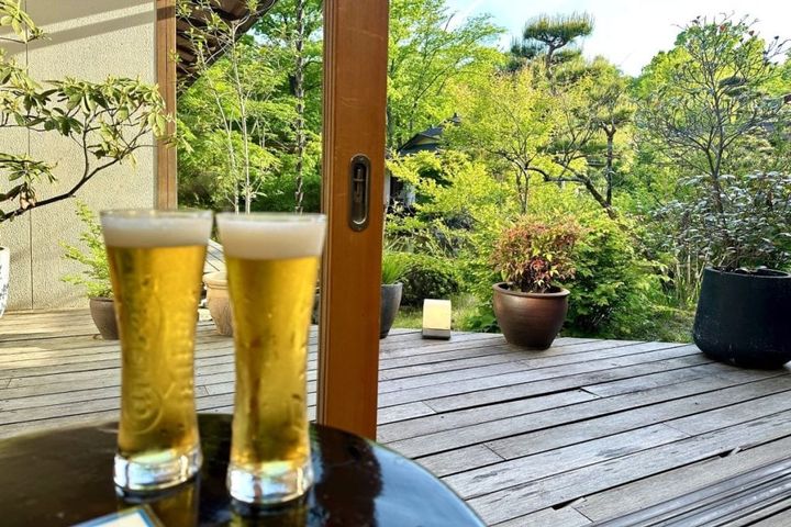 「別邸 山風木」では滞在中ずっと飲み物が「オール インクルーシブ」。食事のときだけでなく、チェックイン後のお茶や食後のコーヒーなど、いつでも好きな飲み物をラウンジや客室で楽しむことができます。ラウンジからは美しい日本庭園を眺めることができ、お風呂上がりにいただくビールは最高でした!
