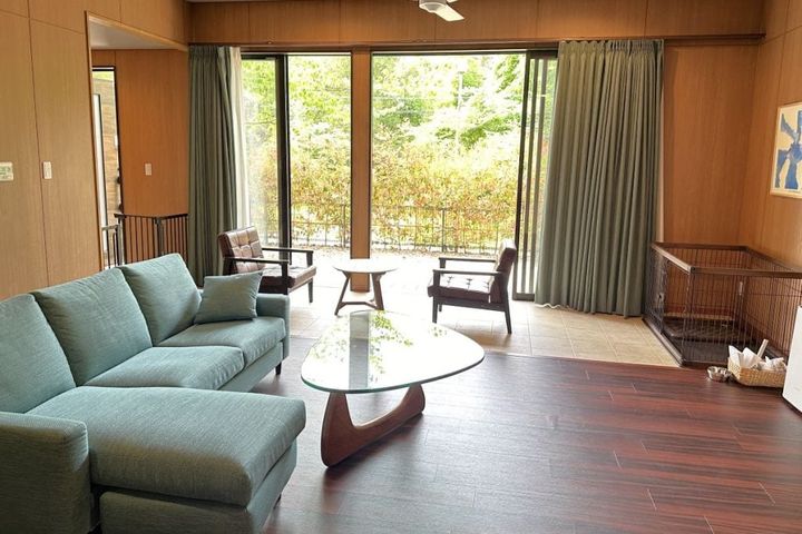 60㎡の別棟にはリビングルームとベッドルームがあり、荷物を広げても余裕の広さ。大きなソファがあり、戸建てのように寛げます。宿泊した日は暖かかったので必要ありませんでしたが、床暖房付き。寒くても快適に過ごせそうです。