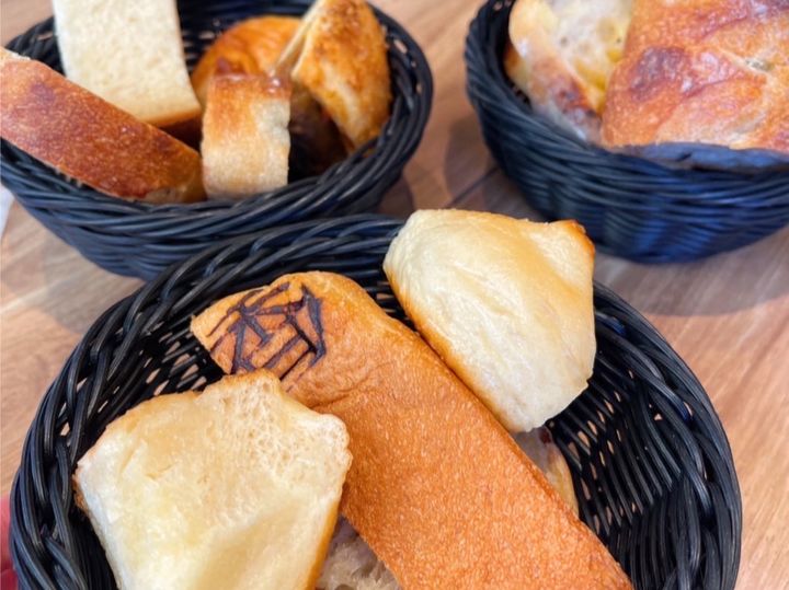 パン食べ放題は、小さなバスケットにカットされたパンを自由に盛るシステム。