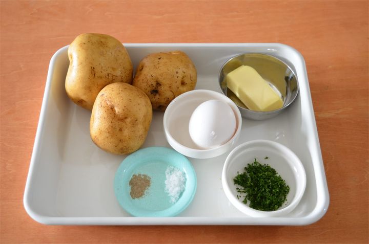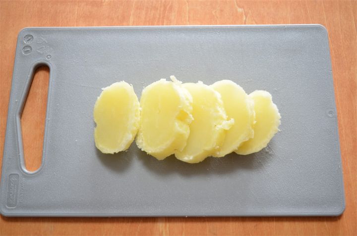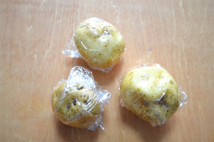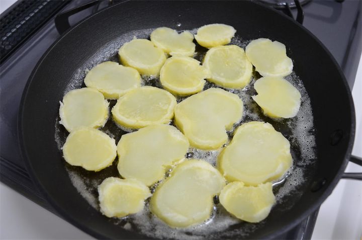 1.じゃがいもを水で濡らしラップで包んだら、600Wの電子レンジで6分加熱する。加熱後皮を剥き、1cm厚さの薄切りにする。