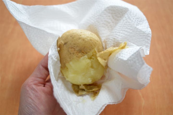 熱いのでキッチンペーパーなどを使って剥いてください。