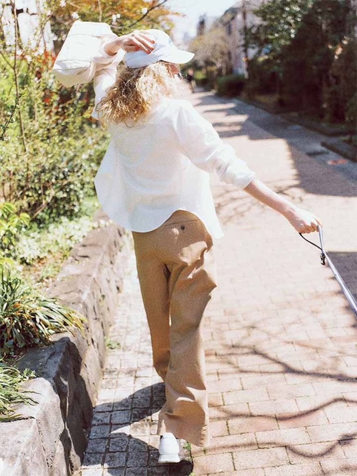 サイドの丈感がいつもよりすっきりしたシャツに、2タックのワイドなチノの組み合わせ。少し変わったアイテムどうしを定番のスタイルに落とし込むときにもキャップが活躍。洒脱なメンズのような服装が連想され、より洗練されたベーシックにまとまる。ラフな雰囲気には清潔感のある白を選んで。