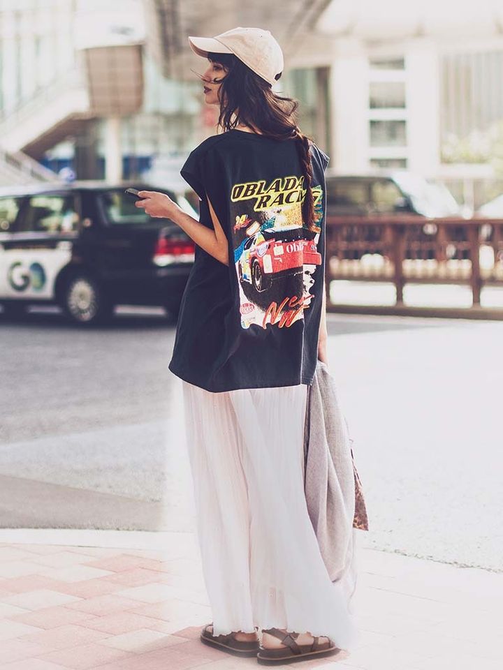 上はカジュアル、下はキレイにわかりやすくテイストを分けたコーディネートにキャップは好相性。キャップが入ることで全体がボーイッシュに落ち着き、Tシャツのメンズっぽいルーズさやスカートのキレイな甘さがそれぞれ浮かない好結果に。黒とも白ともなじみやすいベージュを選んでなじみよく。