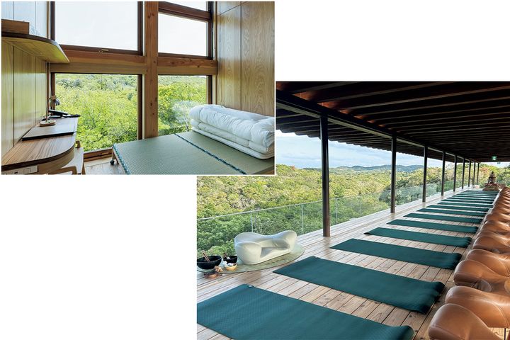 日本杉を組み合わせて作られた全長100mのウッドデッキは、淡路島の山々の中に突如出現したまるで異次元空間のよう。緑に囲まれた空間で、木の温もりや香りを感じながら行うヨガや瞑想は集中力を高めて心身をほぐし、整えます。