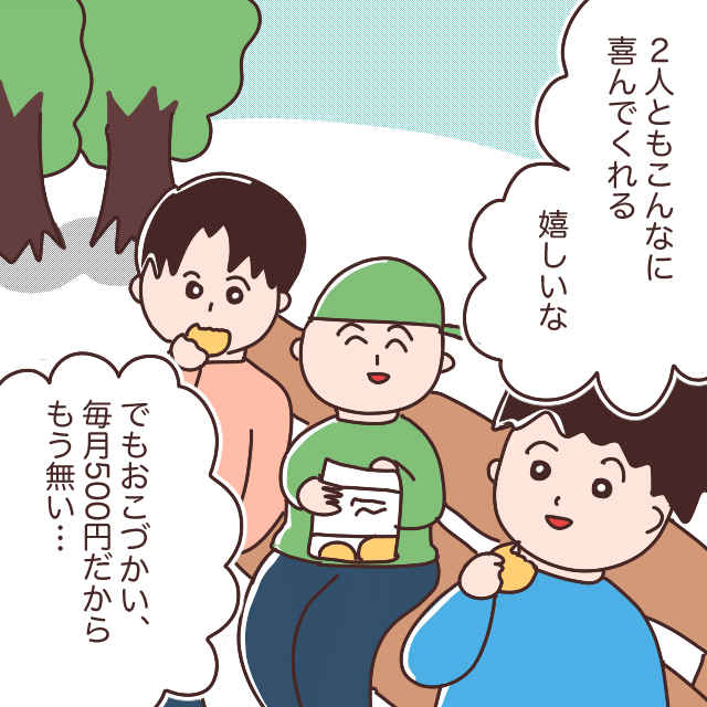 「2人ともこんなに喜んでくれる。うれしいな。でも・・おこづかい毎月500円だからもう無いや・・」