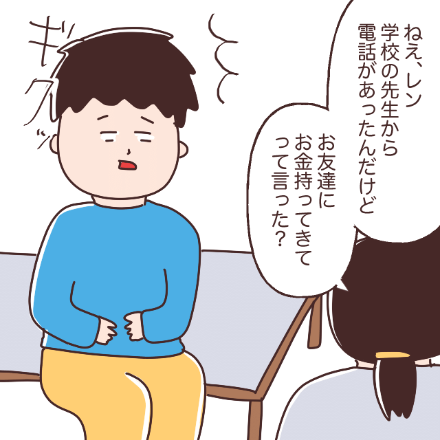「ねえ、レン、学校の先生から電話があったんだけど、お友達に『お金持ってきて』って言った?」