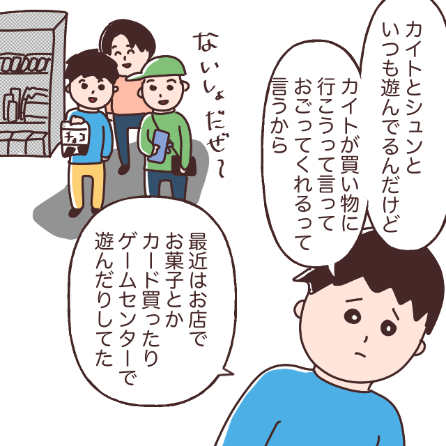 「カイトとシュンといつも遊んでるんだけど、カイトが買い物に行こうって言って・・おごってくれるって言うから・・最近は、お店でお菓子とかカード買ったり、ゲームセンターで遊んだりしてた」