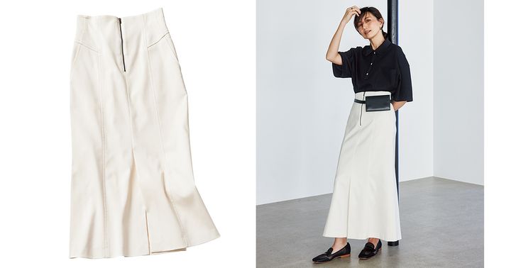 白スカートこそ旬なシルエットを吟味したい。カーヴィーながら下半身をスッキリ見せる計算されたデザイン。