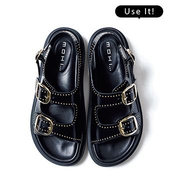 黒スタッズつきサンダル(3) /モヒ(レイビームス 新宿) 黒レザーに好相性なスタッズ。小さく細かく配することで悪目立ちもなく、ちょうどいいアクセントに。