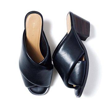 黒パデッドクロスサンダル(6.5) /LOUNIE 甲をおおい込むほどのボリューミィなパデッドで、かかとが無くてもかかとが浮かず、歩きやすい。甲部分も先端も程よく肌が出るので、黒でも重く見えずちょうどいい引き締め役に。
