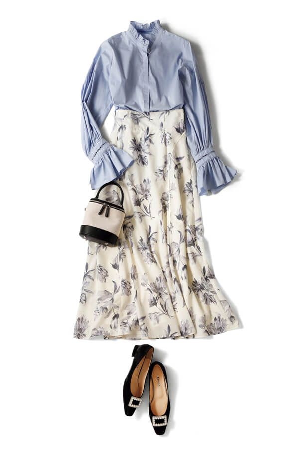 フリルのスタンドネックや絵画風のフラワープリントで、おなじみワンツーコーデにロイヤルな気品を。小物は黒で統一して大人っぽく。