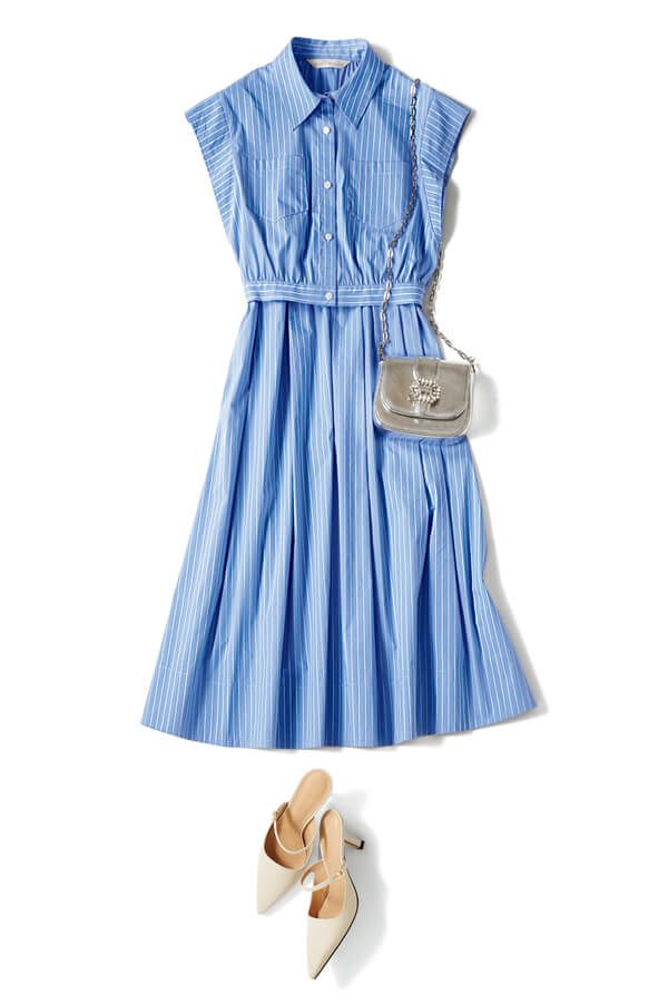 パリッとハリのある素材がきれいめなシャツ×フレアのセットアップ。サックスブルーに浮かべた夏らしい白ストライプが、セットアップの爽やかさをさらに強調!