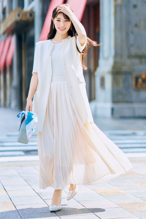 全身白でものっぺり見えないのは、それぞれ異なる質感のアイテムだから。エアリーなスカートが風に膨らむ可憐な姿でも魅了して♡