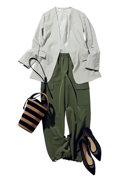 気合いを入れたい日はカーキパンツとジャケットのハンサムスタイル。シアーブラウス&チュールパンプスで重たくなりがちなジャケットコーデに抜け感を。トレンドのラフィアバッグでコーデの鮮度を上げて。