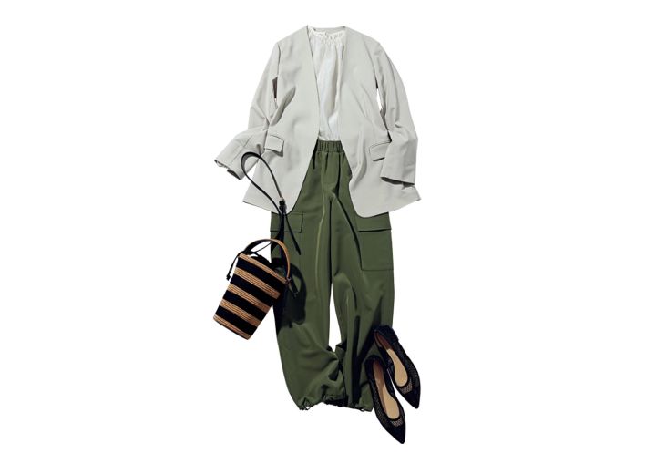 セットアップ(ジャケット)¥14,990/アンフィーロ(オンワード樫山) ブラウス付きワンピース(ブラウス)¥19,910/ミラ オーウェン ルミネ新宿2店 カーゴパンツ¥3,990/シューラルー(ワールド) バケツバッグ¥6,930/カシュカシュ(アンビリオン) チュールパンプス¥2,290/GU