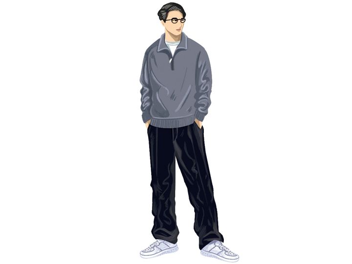 パンツは裾をワンクッションさせるのがポイント。メガネで知的な印象をプラスした。