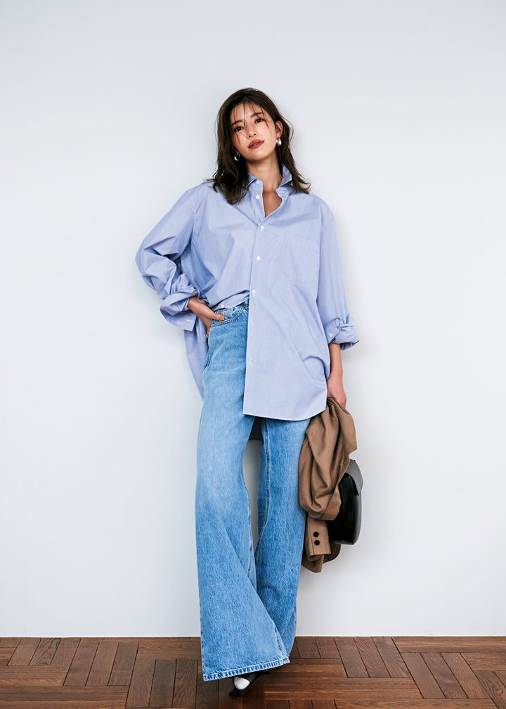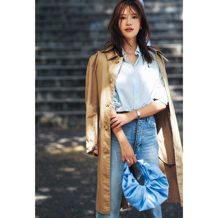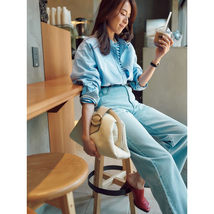 暖かくなってきて、シャツやブラウスを着たくなる時期。定番の白ももちろん素敵ですが、今年の流行色でもある水色のシャツも使えそう。パンツと合わせたワンツーコーデが華やかになるのでぜひ試してみて。着こなしを紹介します。