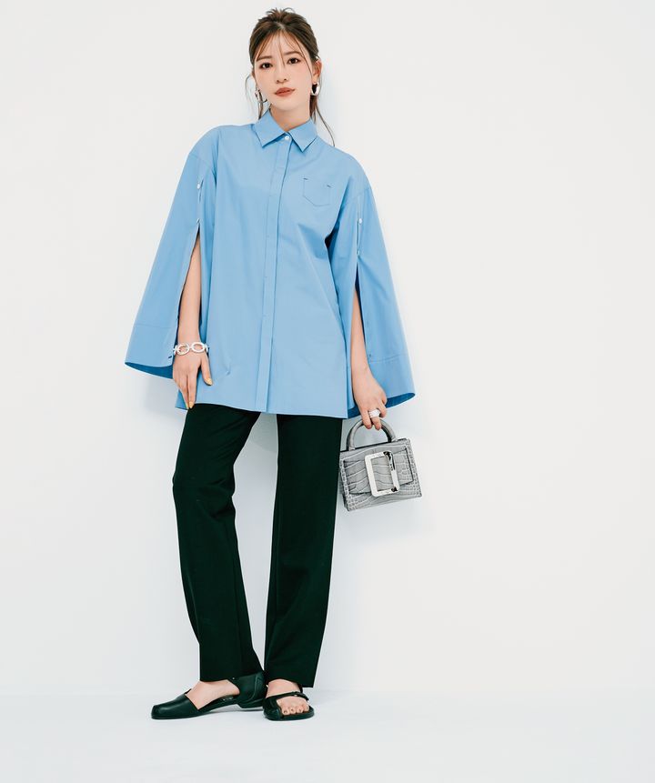 ポンチョ風デザインのブルーシャツは特別感のある一枚。シンプルな黒パンツに合わせてもそれだけでサマになります。シャツはderes(デレス)パンツはorb.(オーブ)、サンダルはシーセイ、バッグはBOYY(ボーイ)のもの。