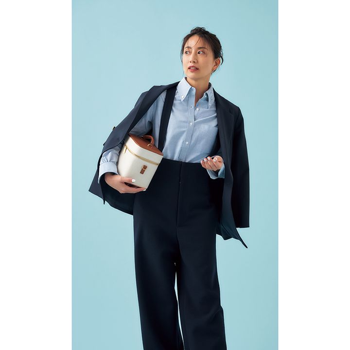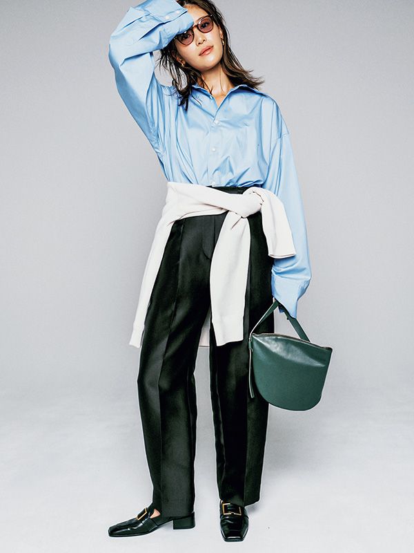 流行りのサスペンダーパンツともシャツは相性バッチリ。ブルーシャツなら白シャツよりもモードになりすぎず、トライしやすい組み合わせです。シャツはマディソンブルー、ジャケットはガリャルダガランテ、パンツはギャルリー・ヴィー、バッグはリュニフォーム。