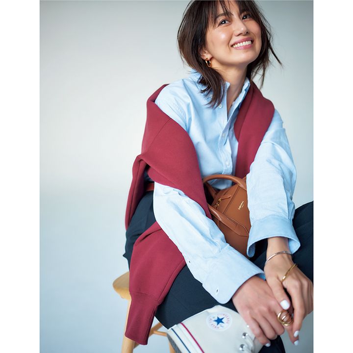どうしても真面目な印象になってしまうシャツとパンツのコーデには、スウェットを投入してカジュアルさを足すのもおすすめ。差し色にもなり、こなれた雰囲気が出せます。